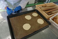 一次発酵終了後、生地を計量し分割して、広げ、二次発酵させます。