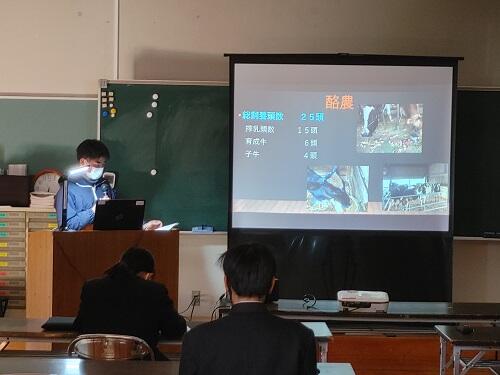 はじめに、本校で行っている課題研究の学習成果発表を行いました。就農支援アドバイザーの満島様から本校の取り組みに講評をいただきました。
