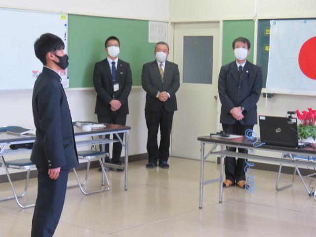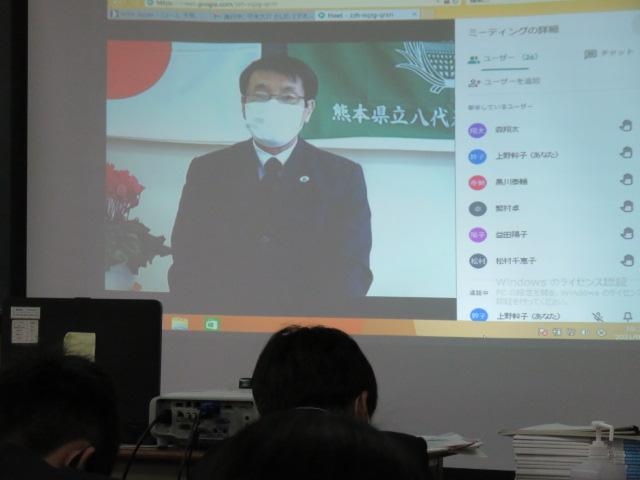 熊本県のリスクレベルが『レベル5 厳戒警報』と言うことで、3学期始業式・表彰式は、リモート形式で開催しました。生徒職員初めての試みではありましたが、何事もなく終えることができました。生徒たちは前のスクリーンを見ながら、静かに話を聞いていました。