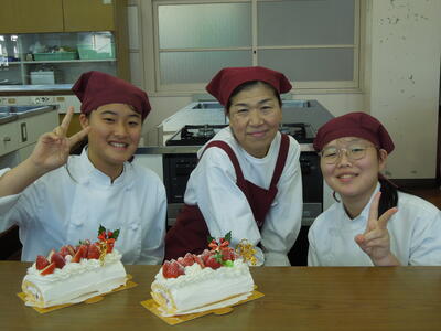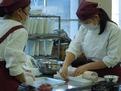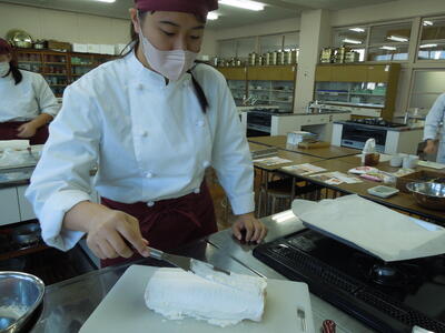 12月8日に米粉インストラクターの河野先生に来校いただき、米粉のシフォンロールケーキを教えて頂きました。