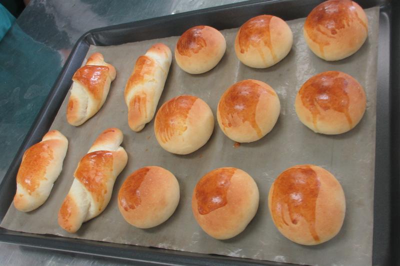 1次発酵後から、分割、計量、丸めを行ない、生地を休ませてから、くるくる巻いてロールパンを天板に並べ、2次発酵を行ないました。焼く前に彩りをよくするために代表の生徒にたまごをうっすら塗って、10分ほど焼き、見事おいしそうなロールパン・マルパンができました。