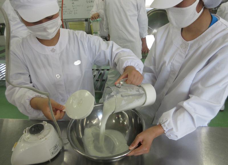 2年食品科学科の生徒たちが、6月25日と7月6日にヨーグルトを発酵させて作る乳酸飲料を製作しました。日頃飲んでる乳酸飲料は合成酸乳を使っているものが多いですが、今回はヨーグルトを作り、ミキサーで砕いて作る方法で製作しました。ヨーグルトを均質化するために10分ほどミキサーにかけ、その後温度を調節しながら、低温殺菌し冷ましてから香料を添加してペットボトルに詰め、完成しました。