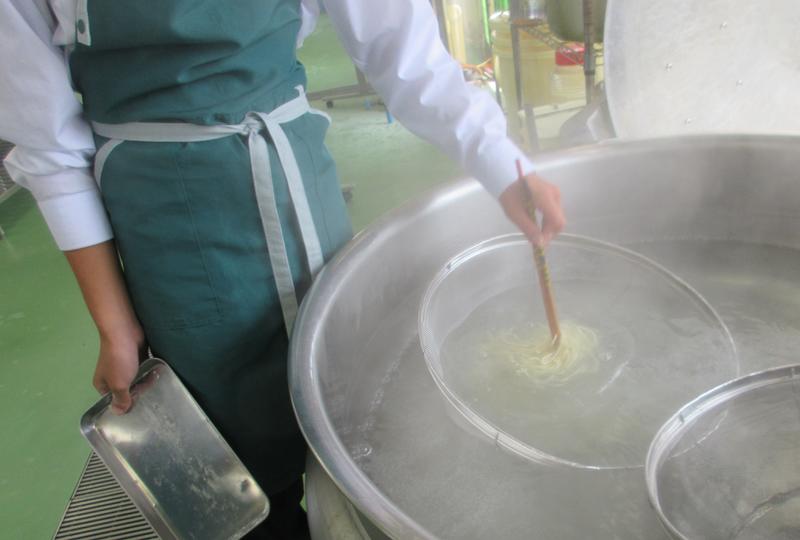 1年園芸科学の生徒たちは、先週うどんを製造しましたが、本日28日は、かん水(食品添加物)を利用した麺作りを行いました。かん水の影響で黄色い麺ができ、製麺機を通すと細く切れた麺に仕上がりました。