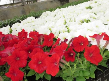 「ペチュニアですね!赤と白の鮮やかな感じがいいです。一面に咲いているとカーペットみたいでしょ?花だんでもいいですが、プランターとか鉢に植えてもいいですよ