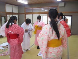 着付け実習始まりました 投稿日時 : 2016/05/16 福祉家庭科 福祉家庭科3年生では先週から、本格的に課題研究を実施することができるようになりました。着付け班では、外部講師の先生に来てもらい、着付けを本格的に学ぶことができます。初回は、浴衣の着付けから始まりました。一年間かけて、帯結びまでマスターできるように頑張ります。