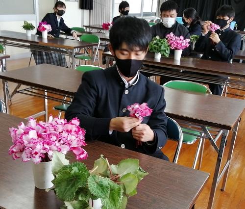 明日、3月1日(月)は卒業が行われます。それに合わせて、生徒会および農業クラブ、家庭クラブの生徒で卒業生のためのコサージュ作りを行いました。今年は初めての取り組みとして、学校で栽培されたシクラメンを材料にして行いました。今年は新型コロナウイルスの影響で、在校生は式へは参加できませんが、卒業生への感謝の思いを込めて作りました。卒業生の今後のご活躍を期待しております。