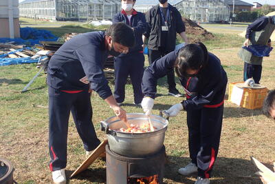 本日、午後から本校の食品製造室で、竜北東小学校の生徒達と一緒にナシを使ったジャム作りを行いました。
