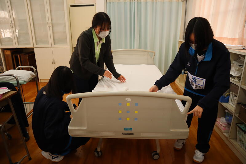 1年生は、シーツの角のたたみ方や手順、声かけを覚えることが難しかったようですが、先輩達から教わって嬉しそうでした