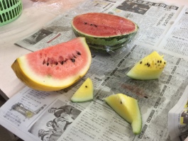 そして3つ目は実習でたくさん汗をかいた後に、いろんな種類のスイカを食べ比べ絵文字:三人