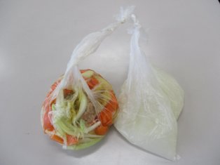 食器を汚さないように、ご飯のポリ袋で食器を包んでいただきました。