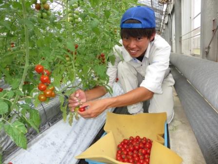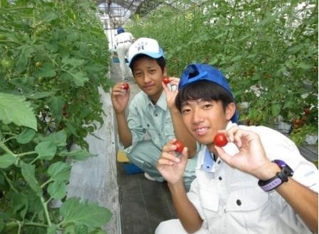 園芸科学科のミニトマトが収穫を迎えました!今日は1年生と3年生が合同で実習でした。3年生が1年生に丁寧に指導して収穫していました。赤色がとてもきれいですね!販売もしています!