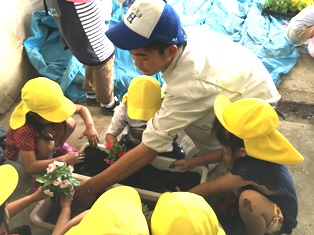 参加した生徒は日ごろ教えてもらうことはあっても、園児に教えながら収穫や花植えを行い、いい勉強になったようです。