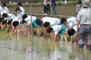 本校の田植えは泉分校もあわせた5学科の1年生と有佐小学校の5.6年生の合同で行いました。