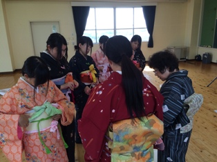 福祉家庭科3年では、課題研究の着付け班が