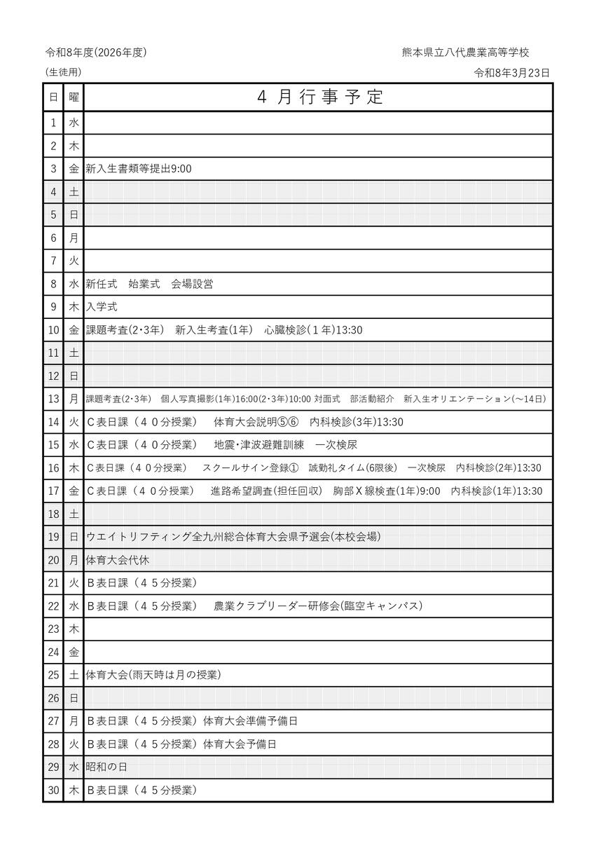 最新の行事予定表(4月)