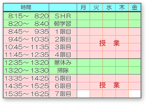Q 登下校の時間は、人によって違うの?A 時間割は、進路希望によって一人一人異なりますが、朝のSHRから終礼までの間は、全員同じ時間数の授業を受けるので、授業の日課は全員同じです。