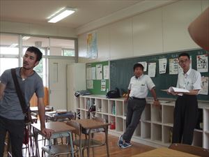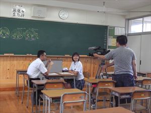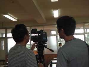 リハーサル撮り中・・・ カメラ位置の確認 見守る先生達(山西教頭と弘先生)