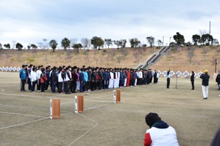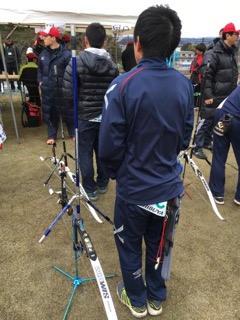 本日は弓具検査、公式練習、開会式が行われました。強風が吹き、気温10度という厳しい条件の中で、風に対する対策を練りながら調整をしました。
