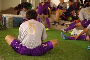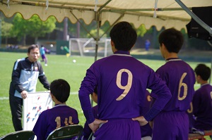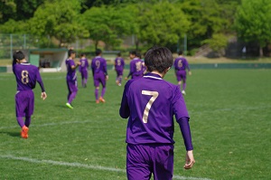 私たちサッカー部は今年のスローガンを「越」とし、今までの自分を越えていくことを目標にしています。昨年「生活面」と「競技面」の2つの柱を軸として練習に取り組んできました。これまで取り組んできたことが少しずつ定着してきましたが、ここで満足するのではなくさらに自分に厳しく今を越える努力をしています。