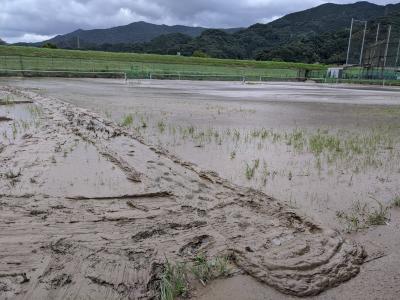 話は変わりますが、八代清流高校のテニスコートは現在泥に埋まっており、使用できません。 7月の球磨川の氾濫によって、テニスコートに大量の泥が流れ込んできてしまったためです。汚泥除去の工事が一日も早く始まることを願っています。