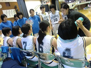 最初に女子の試合があり、熊本西高校と試合を行いました。前半は、20-22の2点差で折り返し、後半に点差が広げられる場面もあり、最後までねばり強く奮闘しましたが、46-58で惜しくも勝利できず、1回戦突破はできませんでした。