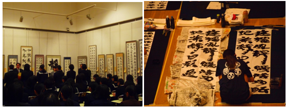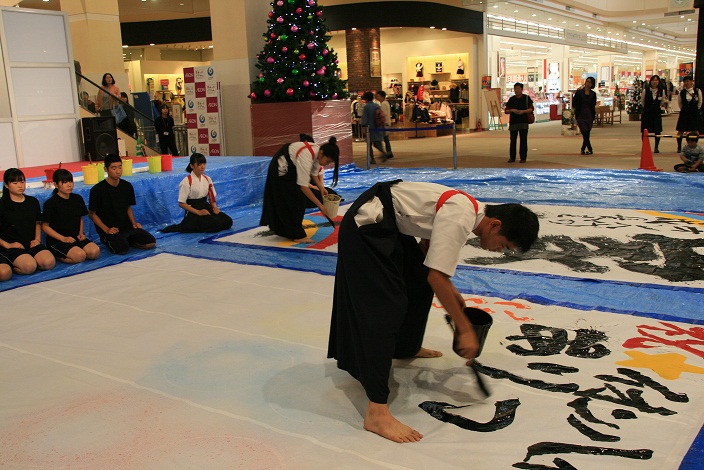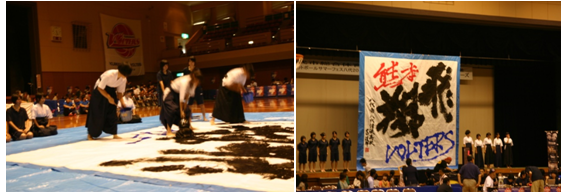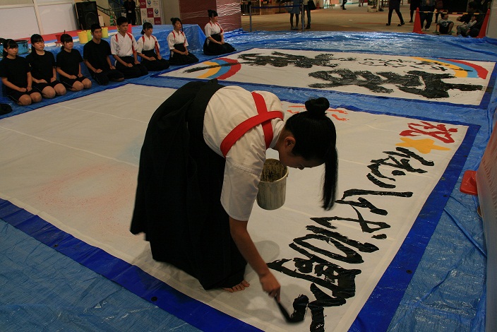 地元の体育館創立記念のイベントでのパフォーマンス。熊本のプロバスケットチームへの応援メッセージを書の中に込めました学校の文化祭にて。日頃の活動の成果を皆さんに見ていただく場です。毎年、一所懸命パフォーマンスを行います。