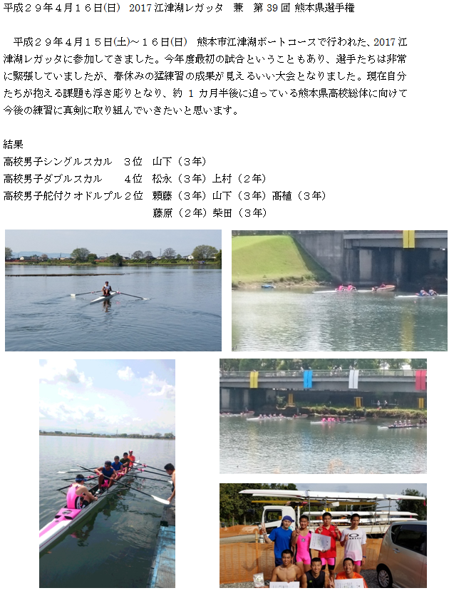 次は6月1~3日に菊池市斑蛇口湖ボート場で行われる熊本県高等学校総合体育大会に向けて、日々の練習を大切にしていきたいと思います。ご声援よろしくお願いします!