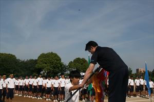 掃除後に、全校集会を行いました。最初に平成27年度第1回表彰式を行いました。代表生徒が、校長から賞状や優勝旗、トロフィーを受け取りました。生徒の表情はとても凛々しく、誇らしげに見えました。周りの生徒からは、仲間の活躍や健闘を喜び称える大きな拍手が沸き起こりました。また、校内の美化コンクールの表彰も行い、懸命に掃除に取り組んでいるクラスが表彰されました。