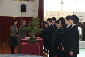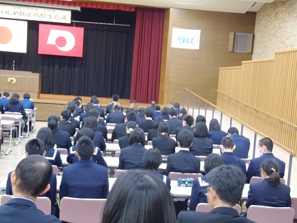 続いて、冬休み明けの全校集会が行われ、教務主任、進路指導主事、生徒指導主事から目標を持つことの大切さ、諦めないための努力、感謝の気持ちを持つ大切さについて話がありました。3年生は、先生方の話を聞き、センター試験前に背中を押してもらえ、不安と緊張が少し和らいだように見えました。2年生は、偉大な3年生の先輩に負けないような自覚が芽生えたように思いました。1年生は、残り数か月で自分の限界まで努力する意識が強くなったように感じました。
