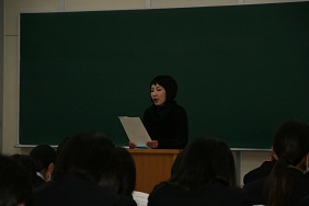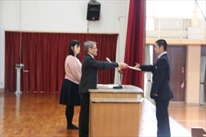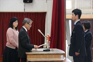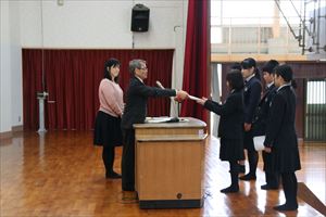 表彰後は、冬休みの過ごし方や今年の反省について教務主任、進路指導主事、生徒指導主事から、学習面の反省や結果を真摯に受け止め、自分の可能性を信じ、目標に向けて頑張ることの大切さや、事故や事件に合わないように気を付け、日ごろからお世話になっている家族へ感謝の気持ちを忘れないことなどについて話がありました。生徒は真剣に話に耳を傾け聞いていました。