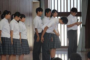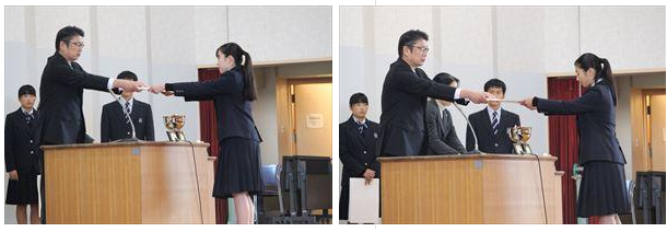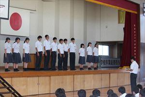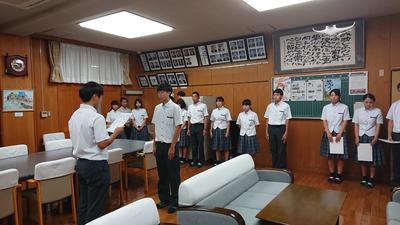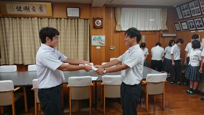 7月9日(水)、旧生徒会役員の皆さんへの感謝状の贈呈式が行われました。校長先生から労いのお話があった後、新生徒会長から旧生徒会三役へ感謝状が渡されました。その後、旧生徒会長の橘くんから旧役員の皆さんへ感謝状が渡されました。