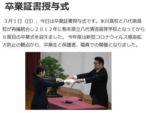 3月1日(日)、今日は卒業証書授与式です。氷川高校と八代南高校が再編統合し2012年に熊本県立八代清流高等学校となってから6度目の卒業式を迎えました。 今年度は新型コロナウィルス感染拡大防止の観点から、卒業生と保護者、職員での開催となりました。