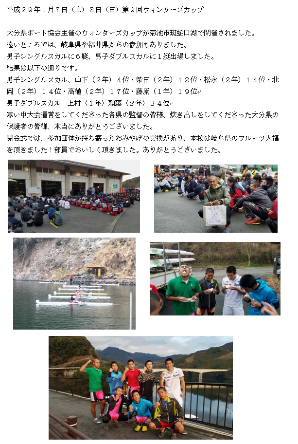 平成29年度全九州高等学校総合体育大会ボート競技が大分県日田市三隈川特設コースで実施されました。参加クルーは男子ダブルスカル髙植君(3年)、山下君(3年)、男子舵手付クォドルプル頼藤君(3年)、柴田君(3年)、松永君(3年)、藤原君(2年)、上村君(2年)の7名が参加しました。
