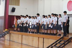 9月20日(金)、前期表彰式、前期終業式を行いました。表彰式では、たくさんの生徒が登壇し、大きな拍手を受けました。前期終業式では、校長先生の講話があり、発光ダイオードやレーザー誘電を例に挙げられ、日々、疑問を持ちながら主体的に探求することが大切であるということや、準備と振り返りを実践しながら授業を大切にすることを話されました。その後、進路指導主事からの講話もありました。