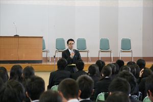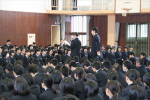 その後、始業式が始まり、校長先生が八代清流高等学校にきて生徒たちへの最初の講話をされました。その中で東日本大震災の復興には次世代の協力が必要であること。立派な社会人に必要な基礎力を身につける場が高校生活であること。高校生活の中で自分の可能性を高めるためには、環境と努力が大事であること。目標も大切であるが目の前のことにも全力で取り組むこと。そして、嫌なことから逃げずに向き合う努力をすること。生徒たちは愛情ある校長先生の話を真摯に受け止めている様子でした。