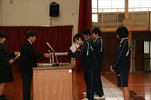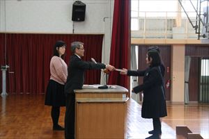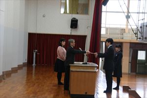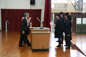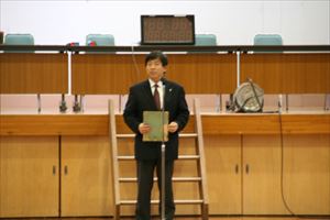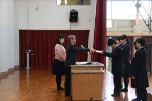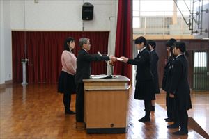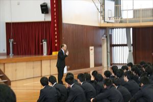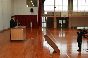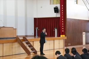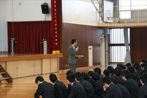 校長先生の挨拶では、1年間を振り返り、様々な場面での生徒の努力や新しい取り組みに対する頑張りを褒められました。そして、特別な何かではなく、日頃からの積み重ねを大切にすること。辛い局面を自分のやりがいに変える我慢強さを持って欲しいと話されました。春休みの過ごし方について教務主任、進路指導主事、生徒指導主事からも目標を持つこと、そして決めたことを継続して取り組むことについて話がありました。