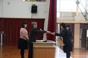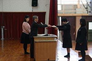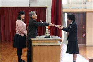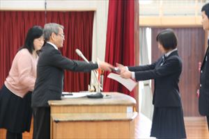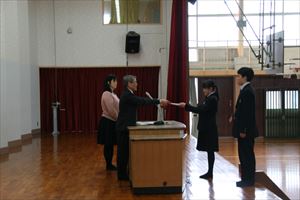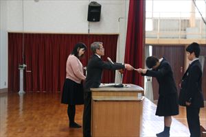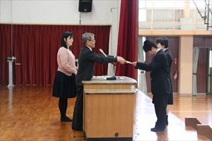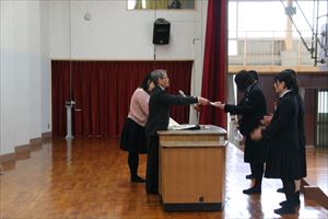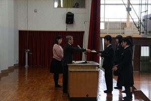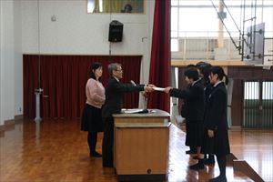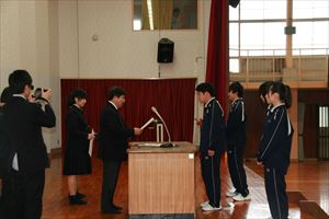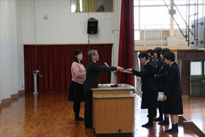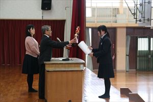 大掃除と式場設営の後、体育館では表彰式が行われました。登壇した3年生たちへは感謝の気持ちを込めて、在校生からとても大きな拍手が送られました。3年間努力して八代清流高等学校を支えてくれた偉大な先輩を慕う後輩たちは羨望の眼差しで見つめられていました。