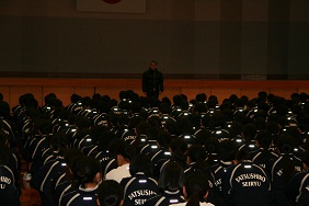 弓道で全国高等学校弓道選抜大会(鹿児島県:1月10日、11日)へ出場します。科学部は九州高等学校生徒理科研究大会(沖縄県:2月7日、8日)へ出場します。そして、各代表は全校生徒の前に整列し、大会に出場する抱負と目標を述べました。生徒会長からの激励を受け、校長からも激励の言葉を受けました。