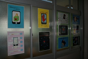 ②HR情報委員会では文化際に作成した情報モラルに関するポスターを校内に掲示しています。