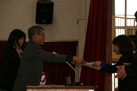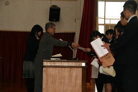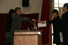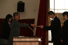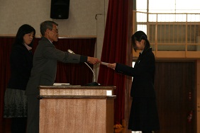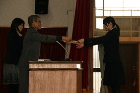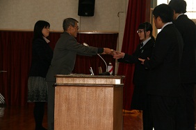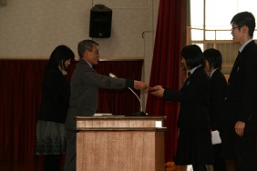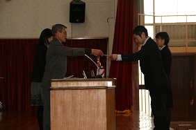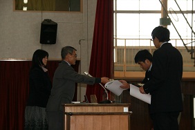 表彰後は、冬休みの過ごし方や今年の反省について教務主任、進路指導主事、生徒指導主事から、学習面の反省や結果を真摯に受け止め、自分の可能性を信じ、目標に向けて頑張ることの大切さや、事故や事件に合わないように気を付け、日ごろからお世話になっている家族へ感謝の気持ちを忘れないことなどについて話がありました。生徒は真剣に話に耳を傾け聞いていました。