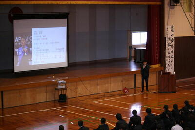 11月18日(木)、人権教育講演会を実施しました。八代市役所職員でパラ卓球アスリートの垣田斉明さんを講師にお招きし、「一歩踏み出そう、無駄にはならない」というテーマでお話をしていただきました。垣田さんのこれまでのご経験をもとに「一歩が道を拓く」ということや、自分が取り組んだことは無駄にはならず、「経験、知識、人脈として返ってくる」というメッセージを伝えていただきました。生徒からの質問に対するお返しにも、皆がこれから生活したり、部活などの競技をしたりしていくうえでの大きなヒントとなるものがありました。小さな一歩でも、勇気を出して踏み出すことの大切さを考える時間となりました。