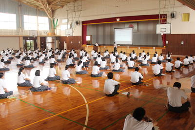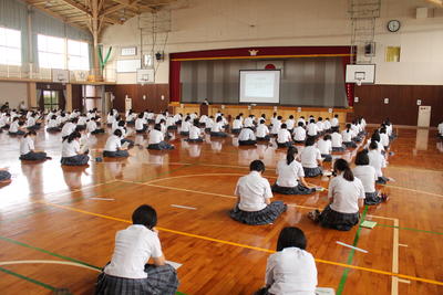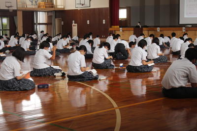 2年次集会を行いました。みんな感染症対策のため間隔をとって座っています。年次主任からの挨拶・生徒会からの「生活していく上での提案」・キャリアプランニングの説明がありました。みんな真剣に聞いていました。