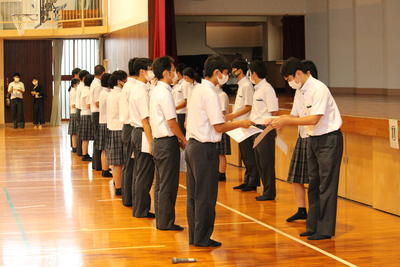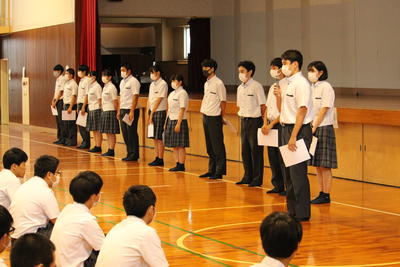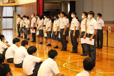 7月10日(金)、生徒会役員任命式が行われました。新旧生徒会役員の紹介の後、お互いに任命状と感謝状を授与しました。旧生徒会長の射場くん(3年)が今までの感謝を伝え、新生徒会長の上村くん(2年)が先輩方への感謝と今後の生徒会活動への抱負を語りました。式後には、校長先生から旧役員への感謝の言葉と新役員への激励の言葉を頂きました。清流高校の学校生活が更に充実したものになるよう、生徒会が中心となって取り組んでいきます!