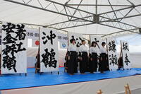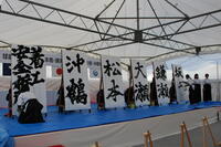 12月4日(日)、球磨川流域橋梁(坂本橋・鎌瀬橋・大瀬橋・松本橋・沖鶴橋)着工式典が八代市坂本町で行われ、そのオープニングアトラクションとして、書道部が書道揮毫を披露しました。それぞれの橋の名前を力強く表現し、工事の安全を祈願しました。