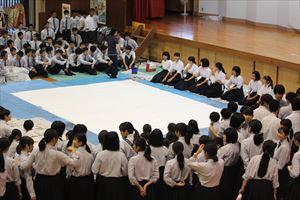 | 開会行事 開会宣言 | 開会行事 校長挨拶(岩本校長先生) | 開会行事 生徒会長挨拶(射場くん 2年) |