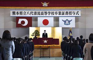 3月1日(日)、今日は卒業証書授与式です。氷川高校と八代南高校が再編統合し2012年に熊本県立八代清流高等学校となってから7度目の卒業式を迎えました。 今年度は新型コロナウィルス感染拡大防止の観点から、卒業生、保護者、職員、在校生代表の2年上村くん出席のもと開催いたしました。