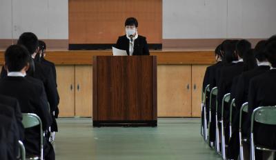 引き続き始業式が行われました。飯田校長先生が1年前の新聞から、中学生の「休校で気付いた学校へ行く意味」という投書を紹介され、学校は成長を実感できる場であり、コロナが収束しない中で出来ないことを嘆くより今出来る事を精一杯取り組んでいこう、と生徒へ向けてお話しをされました。そして校歌の静聴が行われ、始業式終了後に新しい年度に関わる校務運営委員の先生方の紹介と、各年次の担任・副担任の紹介がありました。