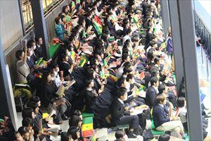 女子ハンドボール世界選手権大会の観戦風景2 セネガルの国旗を模した応援をしました。 |