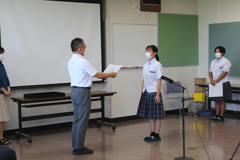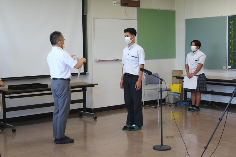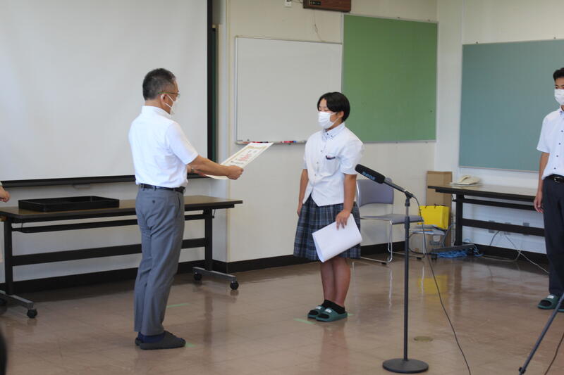 表彰式では、カヌー部の松永さん(3年)、美化コンクール教室の部1位の3年4組、トイレの部1位の1年3組が表彰されました。
