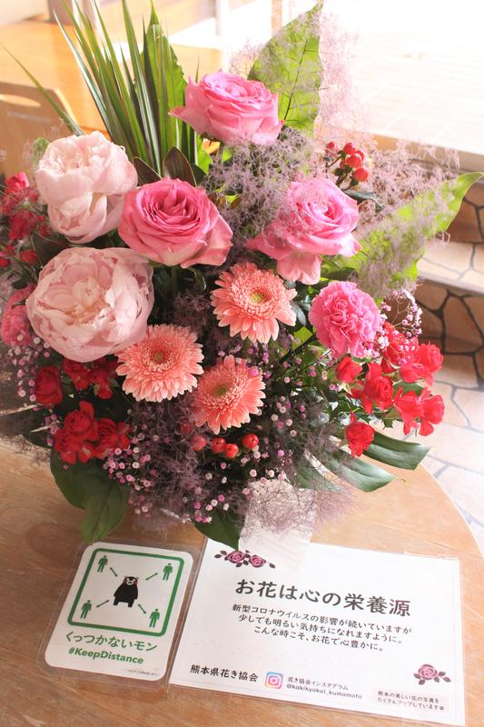 熊本県花き協会様より、くまもと「花っていいよね。キャンペーン」として熊本県産花きのフラワーアレジメントをいただきました。「新型コロナウイルスの影響が続いていますが、少しでも明るい気持ちになれますように。こんな時こそ、お花で心豊かに。」というあたたかいメッセージもそえられています。早速玄関と生徒ホールに設置させていただきましたところ、雰囲気がとても明るく華やかになりました。ありがとうございました。